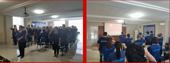 首先,全體人員起立,大會在莊嚴的《國歌》聲中拉開帷幕。在尹郁武同志的帶領下,全體黨員面對黨旗,舉起右拳,重溫入黨誓詞。